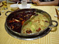 火鍋、という中国の料理らしい。浮いてるのは具ではなくスパイス。食べる時に取る。ちなみに、左側めっさ辛い。